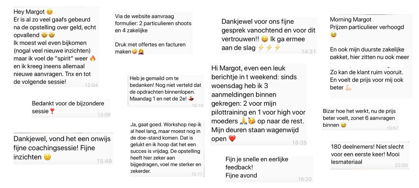 Coaching van Margot is persoonlijk met veel betrokkenheid, liefdevol maar ook recht door zee en soms confronterend, waardoor je daadwerkelijke andere keuzes gaat maken vanuit meer zelfvertrouwen en zelfliefde.